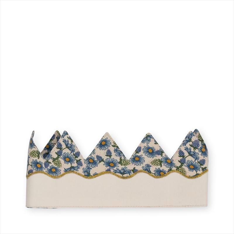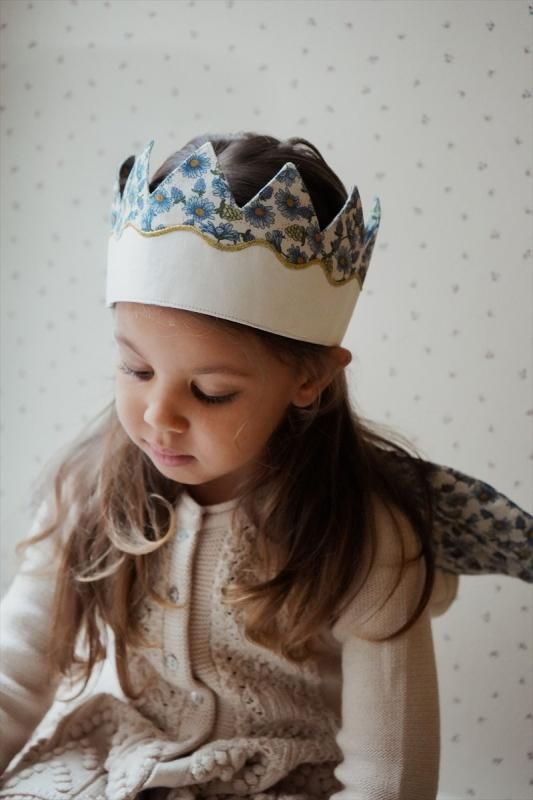 綺麗な青の花柄生地で丁寧に作られた羽、クラウン、ステッキの3個がセットになっています。