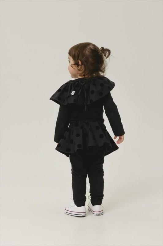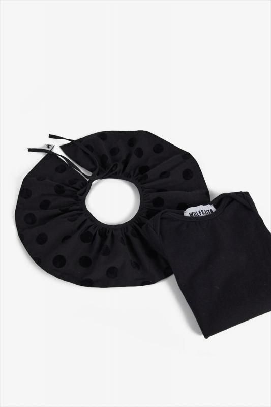 上品なブラックカラーに、大きなドット柄のフリル襟が目を惹く