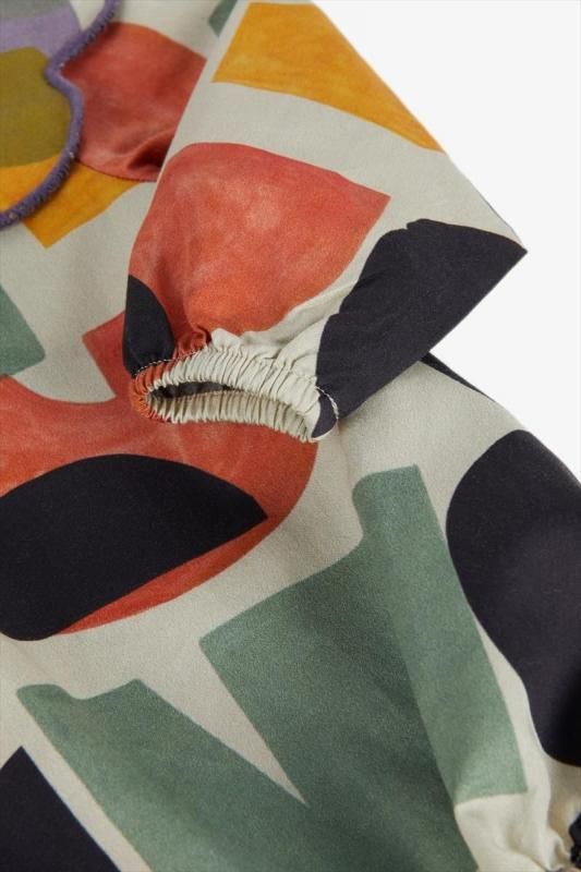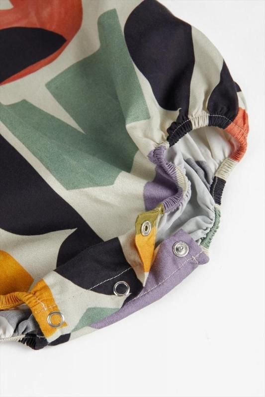 大胆な幾何学模様を全体にあしらった個性派ロンパース。