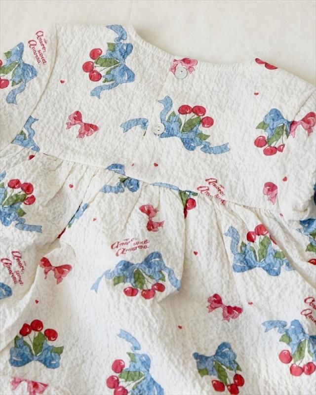 ふんわりシルエットのチェリー柄のロンパース