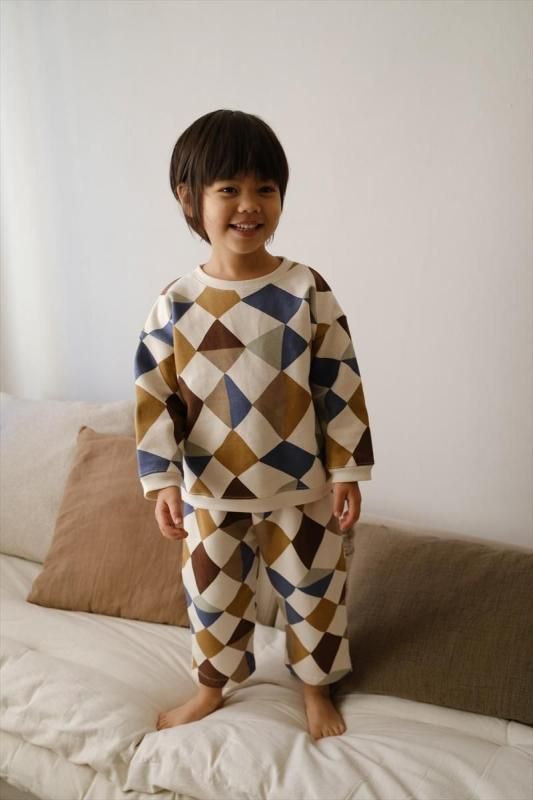 カラフルなダイヤ柄が印象的なコットンパンツ。