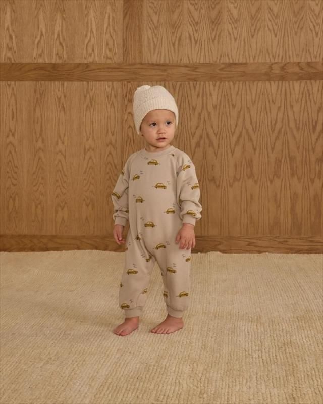 くるまプリントの長袖スウェットロンパース。