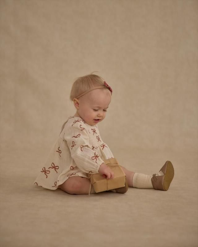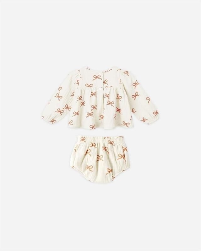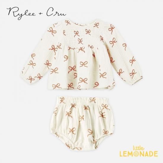 Rylee + Cruの新作セットアップは、 上品なリボン柄が目を惹くデザイン。 軽やかで柔らかなコットンガーゼ素材を使用し、 肌触りもやさしく快適。 ふんわり広がるブラウスとブルマの組み合わせは、 フォトにも映えるクラシックなシルエットです。 おそろいのブルマは ウエストと裾がゴム仕様で動きやすく、着脱も簡単。 普段使いからお出かけまで幅広く活躍します。 上下セットでの着用はもちろん、 単品でもコーディネートが楽しめる便利なアイテムです。 |