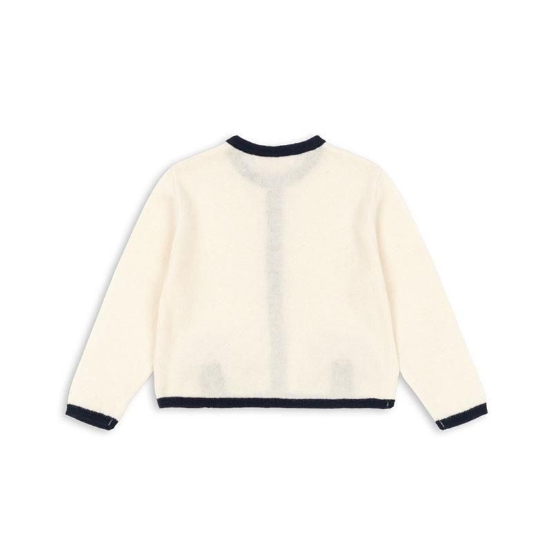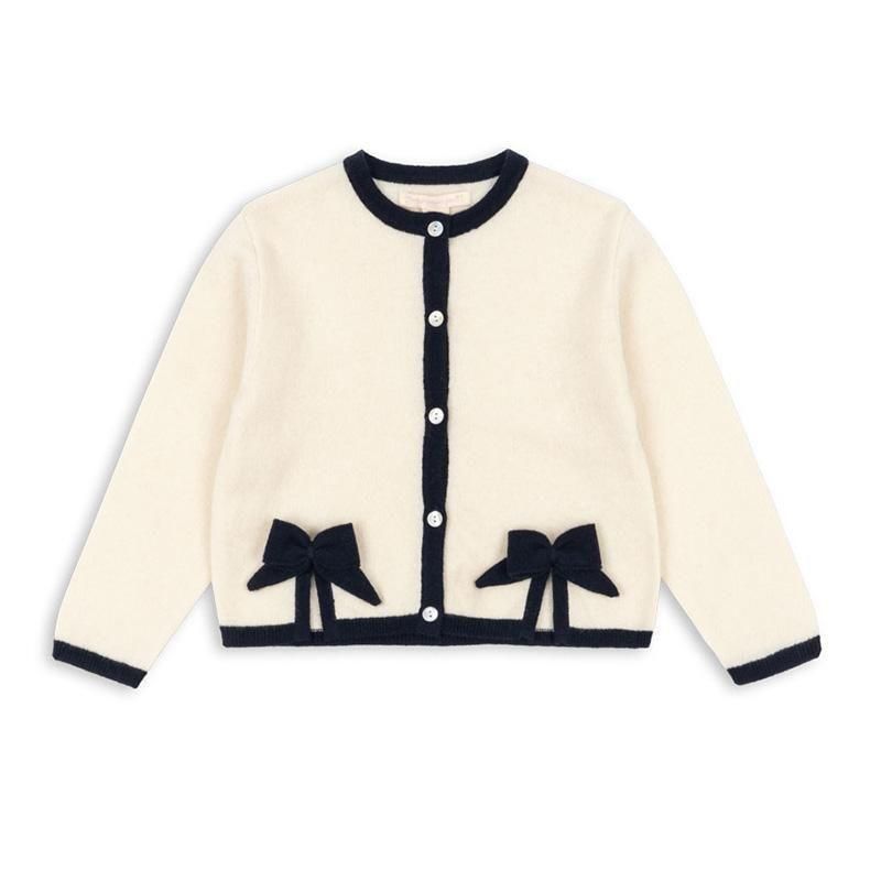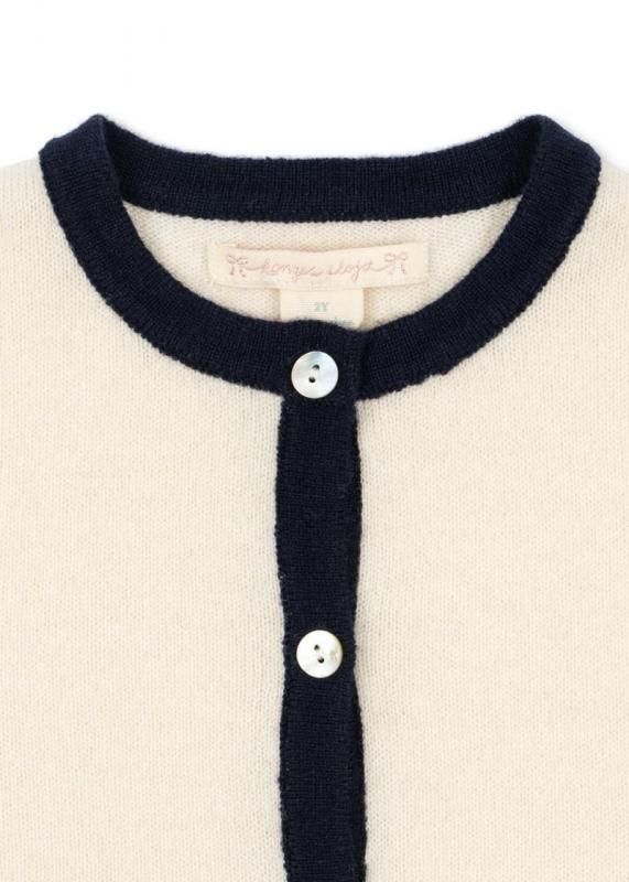 世界中のベビー&ママに愛されるデザインと オーガニックコットンにこだわった コンゲススロイドの2025A/Wコレクション。 柔らかい100%ウール素材のカーディガン。 リボンのディテールがアクセントになったクラシックなデザインで、 ラウンドネック、配色の縁取り、 フロントには上品なシェルボタン(貝ボタン)をあしらっています。  |