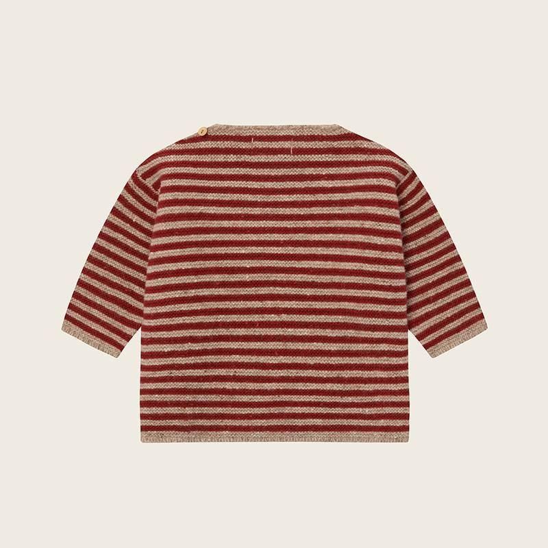 イギリスのアパレルブランド organic zooから届いた、 AWコレクションにあわせたいニットウェアシリーズ。 最高級のイタリア製バージンウール糸100%を使用したニットセーター。 クラシックなストライプ柄はどんなコーディネートにも合わせやすく、 着回し力抜群の一枚です。 ボートネックとドロップショルダーのスリーブが、 シンプルながらも上品でスタイリッシュな印象に。 袖口はロールアップできるので、 外遊びやアクティブなシーンでも快適に過ごせます。 肩にはウッドボタンをあしらい、お着替えもスムーズに。 ヴァージンウールを使用し、環境にやさしく柔らかで心地よいぬくもりを実現しました。 ミュールシングフリー RWS認証(責任あるウール基準)糸を使用 |