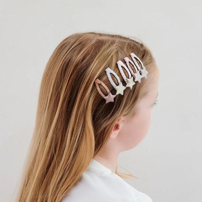 このグリッター付きの星形クリップは、きらきらと輝いて髪を華やかに彩ります。